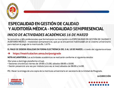 ESPECIALIDAD EN GESTIÓN DE CALIDAD Y AUDITORÍA MÉDICAMODALIDAD SEMIPRESENCIAL