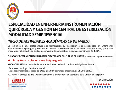 ESPECIALIDAD EN ENFERMERIA INSTRUMENTACIÓN QUIRÚRGICA Y GESTION EN CENTRAL DE ESTERILIZACIÓN MODALIDAD SEMIPRESENCIAL